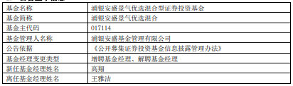 浦银安盛景气优选混合增聘高翔 王雅洁离任